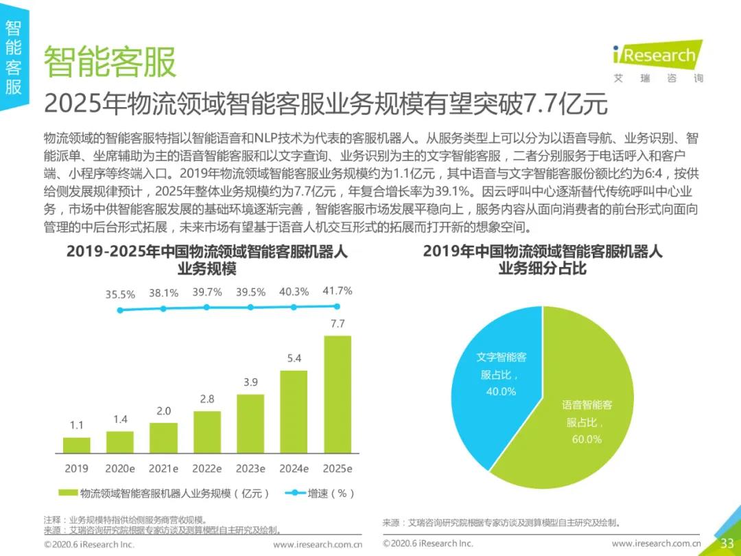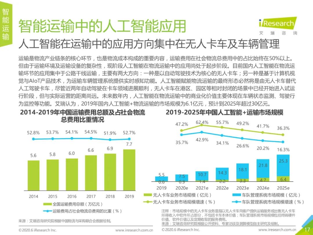 报告指出,2019年人工智能+物流的市场规模为15.9亿元,预计到2025年市场规模将接近百亿。